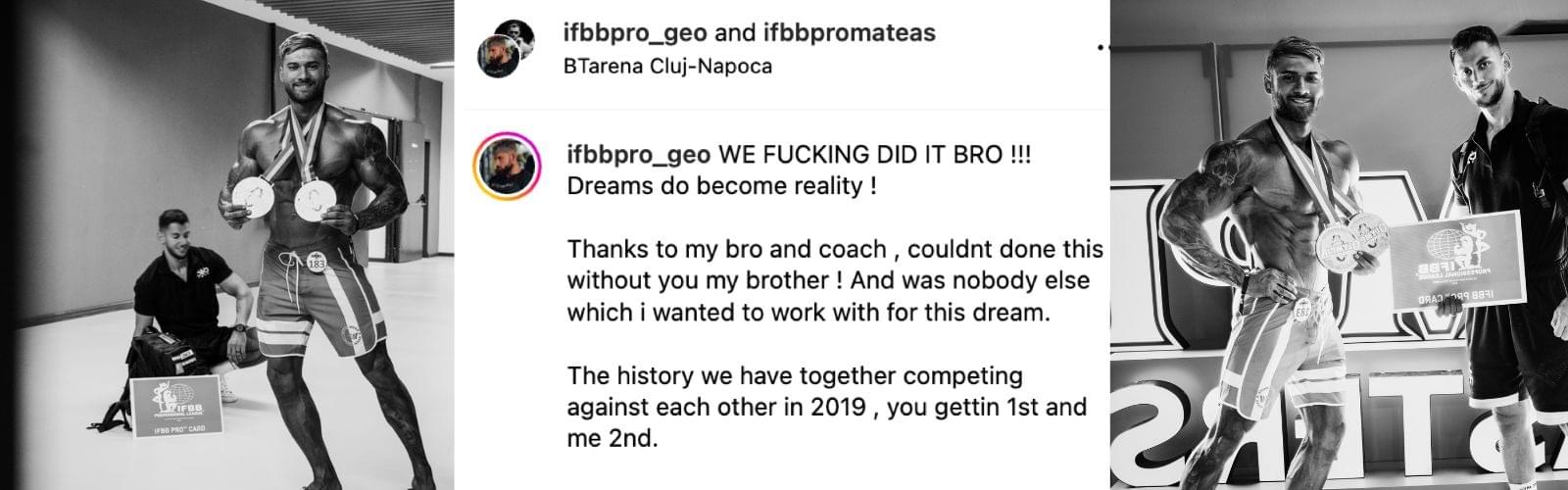 2019 – PCA Manchester, am concurat împotriva lui Georgian Drăgoi. Eu am luat locul 1, el 2. La un an după ce am devenit IFBB Pro, a venit la mine cu scopul de a lua și el cardul – și exact asta am făcut.